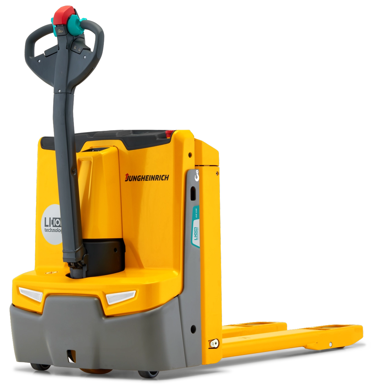 The particularly efficient and manoeuvrable EJE 114i - 118i electric pedestrian pallet trucks with their integrated lithium-ion batteries offer the perfect combination of economic efficiency and robustness along with the flexibility of our highly efficient battery technology. The integrated lithium-ion battery allows for an even more compact design leading to even greater manoeuvrability and lower weight. This makes them ideal for conventional applications on HGVs or in any other weight-sensitive and confined space. In conjunction with the built-in charger for easy charging at any standard 230-V electricity outlet, lithium-ion technology offers a number of advantages: very long, maintenance-free battery life cycle as well as rapid and booster charging during breaks or downtime. This allows for 24/7 truck availability and flexible use in multi-shift operations.