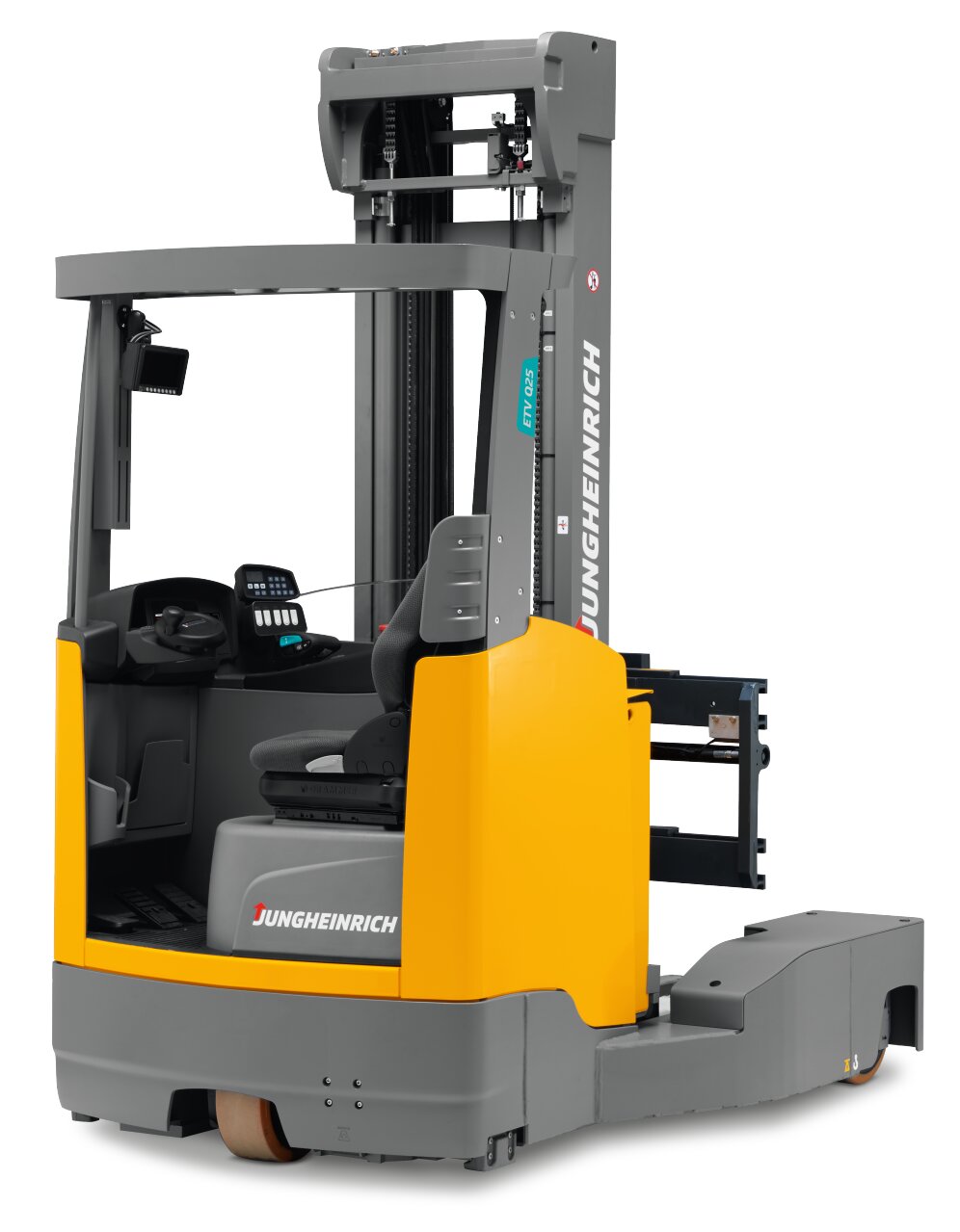 Our versatile and manoeuvrable ETV Q multi-directional reach trucks are the perfect choice wherever oversized goods have to be transported in narrow aisles and lifted to great heights. The electric all-wheel steering allows for the particularly space-saving transport of loads up to eight metres long. 360° steering for minimum turning radius, extremely quick changes of travel direction and five available steering modes ensure highly efficient and safe handling of the truck. From modified normal travel and turning on the spot to sideways and parallel travel – everything is possible. And pre-programmed: Just a simple tap on the control panel and the truck moves in the desired mode. Easy and intuitive handling, excellent visibility, high energy efficiency and various assistance systems render our ETV Q the most versatile helpers in every warehouse.
