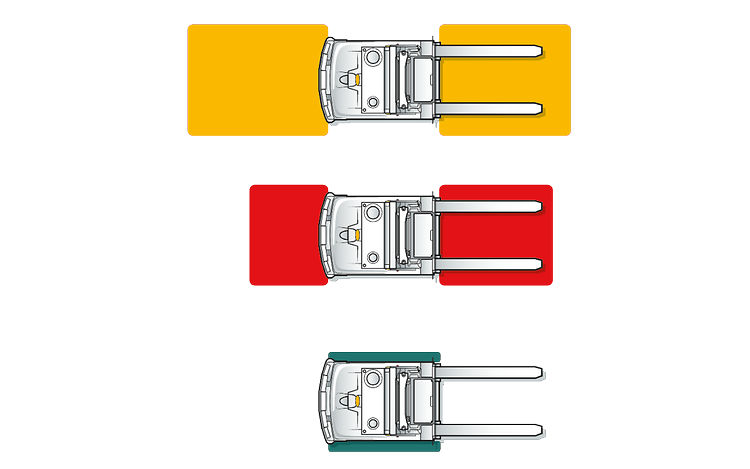 All AGVs are generally fitted with a personal protection scanner in driving direction. Depending on the truck’s speed, the field lengths of the safety area are adjusted. This means the faster the truck moves, the more its warning and protection fields are increased and their surroundings are more proactively scanned.